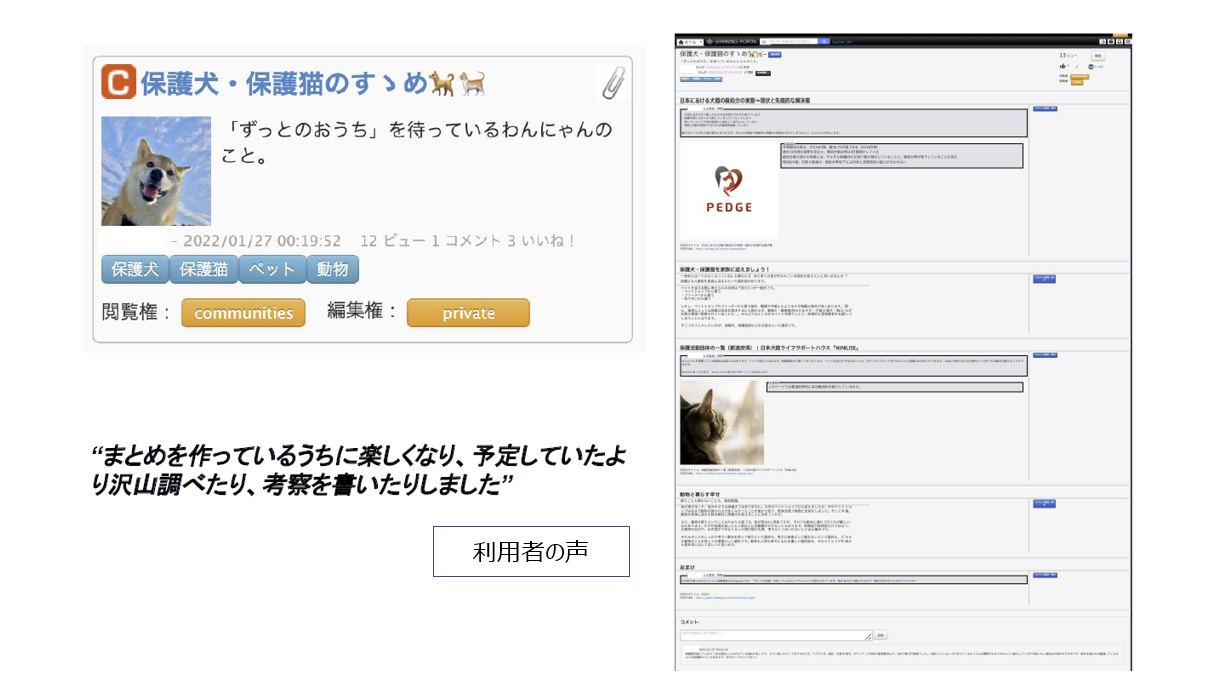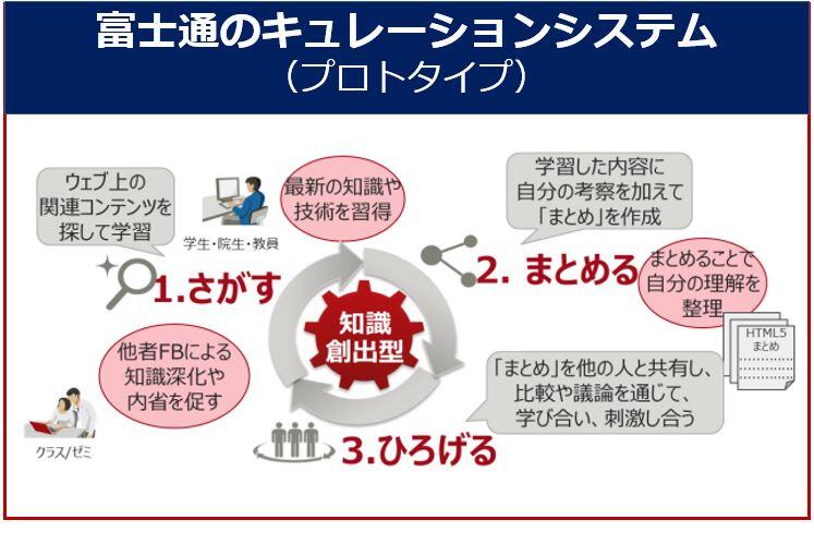 富士通製の協働的な教育・研究環境を提供する「キュレーションシステム」を用いて、3大学での授業利用をはじめとして、学校事務部門での情報共有、テーマを決めて情報をまとめるなど、さまざまな利活用を試みました。教育の場面での活用については、これまでアクティブラーニングという言葉の中に込められている「主体的・対話的で深い学び」を具体的に可能とする仕組みであることも確認できたのではないかと思いました。この仕組みを利用することで、OER素材を保管する『デジタルコンテナー(電子図書館)』の構築も可能となり、それを利用した新たな教育コンテンツの創造、更にはこれらをオンラインでいつでもどこからでも受講できる仕組みとの連携で「学びの場」が激変する可能性を秘めているのです。つまり学校という形に捉われない新たな「学びの場」を構築することができる可能性があると言えます。